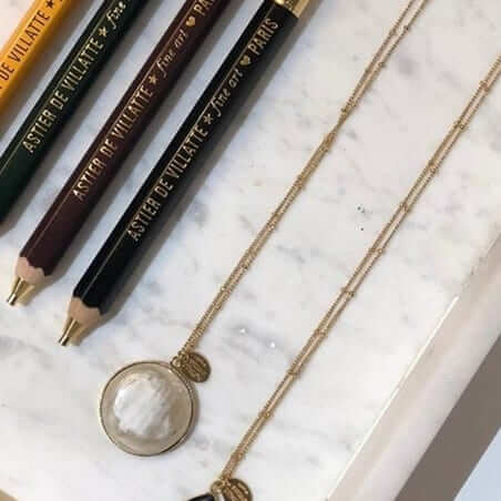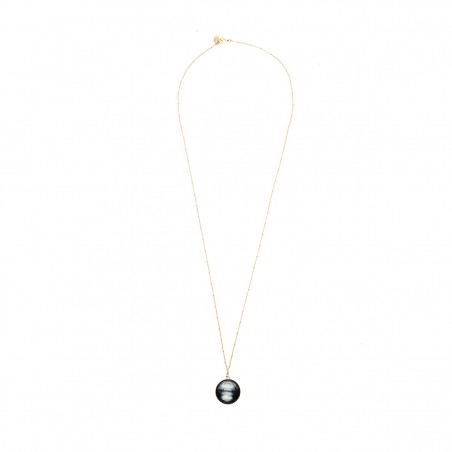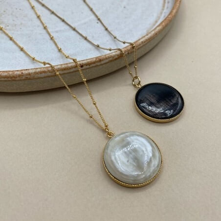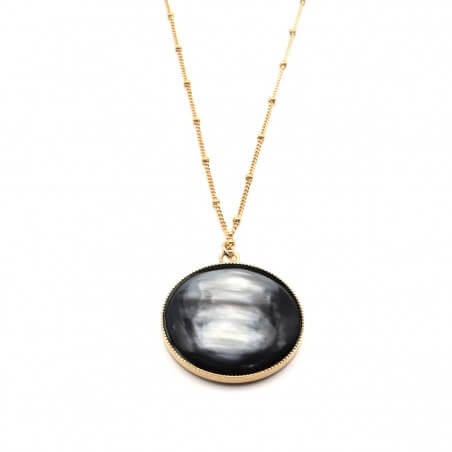 - Yellow gold plated chain necklace, thin and beaded, with a horn round pendant