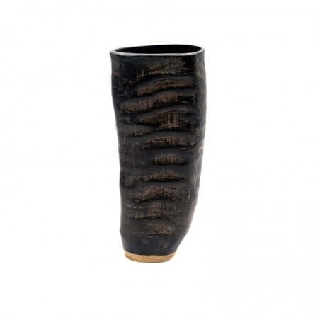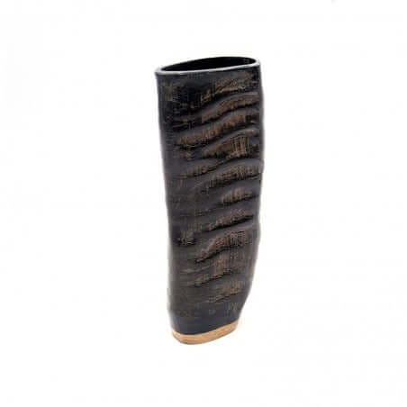 Buffalo horn drinking mug - 50cl model Raw buffalo horn tankard featuring a thick, solid wooden handle and base for long life. Its capacity is around 50cl. Clean in cold water - especially not in the dishwasher. Store away from heat and light. Dimensions: 16.5 * 10cm