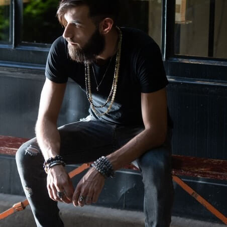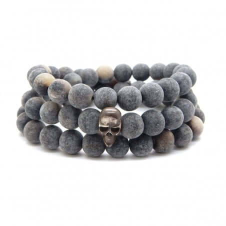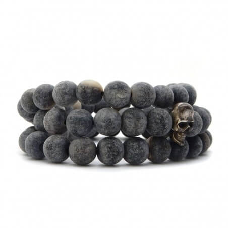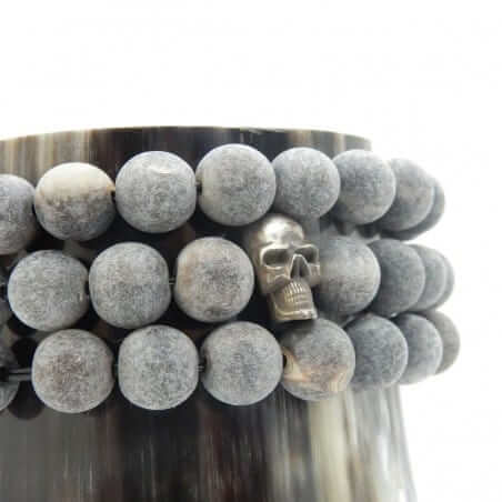 This bracelet is composed with horn beads and a silver skull. Wear it as a unique piece in three rows, to give a rock side to your look.