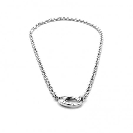 Ce collier se distingue par son fermoir imposant représentant un cadenas qui au lieu de se porter à l'arrière de la nuque devient une pièce centrale du collier ; le fermoir devient alors pendentif. Assortissez ce collier cadenas fabriqué en argent massif avec le bracelet Aquila.