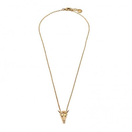 La tête de buffle qui orne ce collier est un des symboles de la collection Memento. Symbole bohème et spirituel, la tête de buffle apporte une touche qui rappelle le voyage et l'exotisme. La tête fait référence à la tête de buffle mais aussi à la tête de bison, de zébu... Ces animaux qui imposent force, puissance et respect et qu'on retrouve habituellement dans les déserts et les films de western.