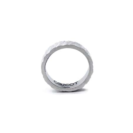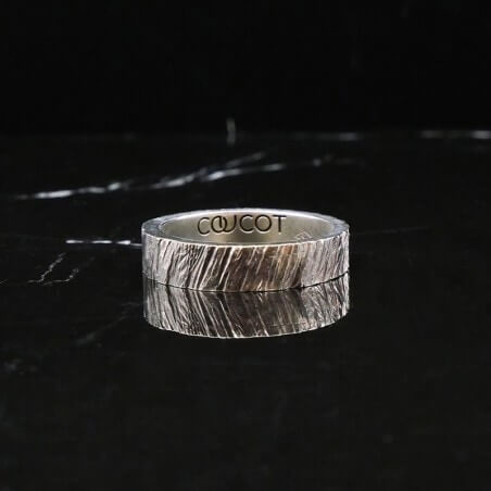 Cette alliance homme est travaillée avec un aspect de matière évoquant le métal à l'état brut. Le minéral se retranscris sur cette alliance par l'interprétation des traits parfaits tels des strates mettant en lumières des lignes séduisantes.