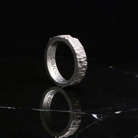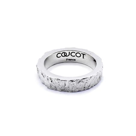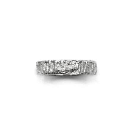 Cette alliance homme est travaillée avec un aspect de matière évoquant le bois à l'état brut. Le relief irrégulier et rugueux contrebalance avec la finition lisse des bords.