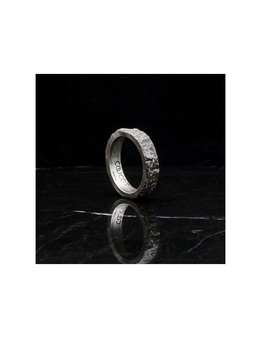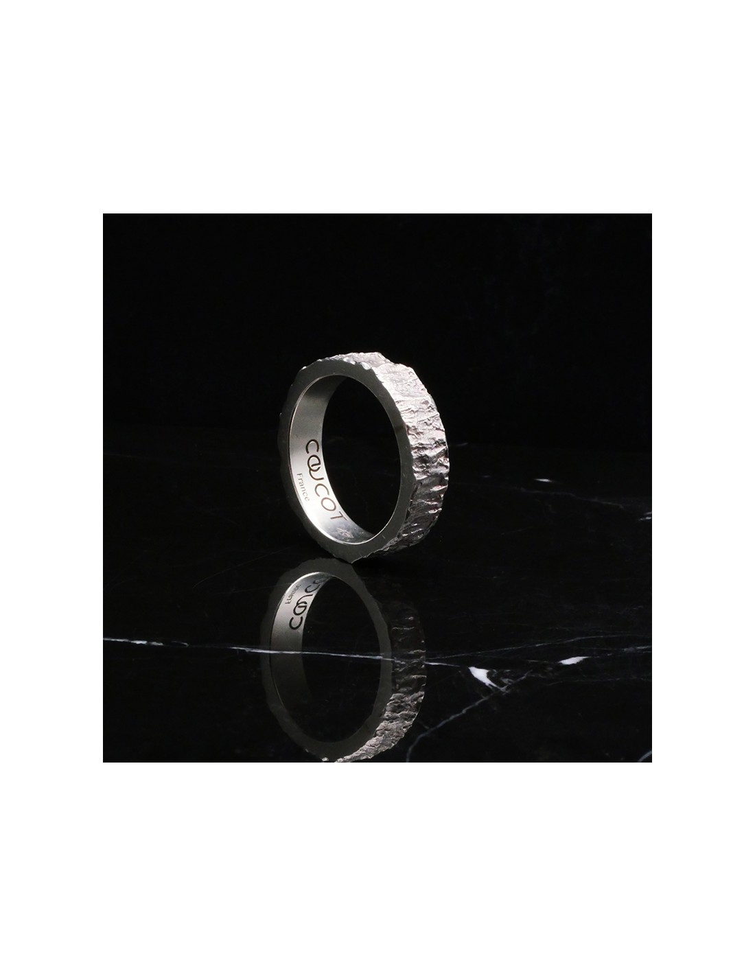 Cette alliance homme est travaillée avec un aspect de matière évoquant le bois à l'état brut. Le relief irrégulier et rugueux contrebalance avec la finition lisse des bords.