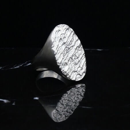 Cette chevalière homme est travaillée avec un aspect de matière évoquant l'écorce d'un arbre à l'état brut. Comme la pratique de la sylvothérapie qui permet de se recentrer sur son soi intérieur, cette chevalière homme transmet un sentiment de calme et de sérénité au toucher.