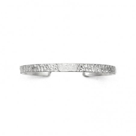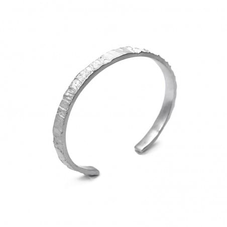 Cette manchette se distingue par un toucher authentique comme un rappel à la nature. Le métal est travaillé avec un effet de matière évoquant le bois à l'état brut. Le relief irrégulier, rappellant l'écorce d'un chêne, est rugueux et contrebalance avec la finition lisse des bords.