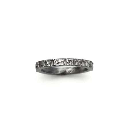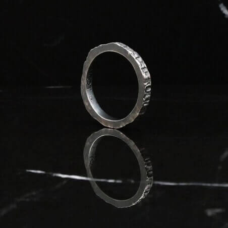 Cette alliance homme est travaillée par son aspect de matière évoquant le bois à l'état brut. Le relief irrégulier et rugueux contrebalance avec la finition lisse des bords.