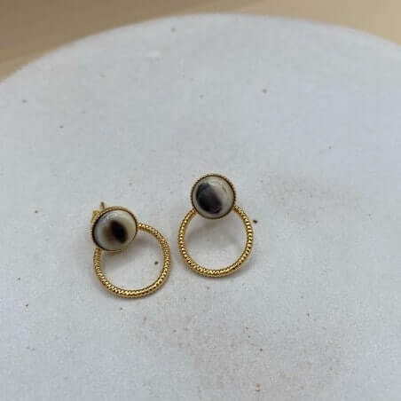 Ces boucles d'oreilles Athéna sont travaillées en corne claire/foncée et plaqué or 3 microns.