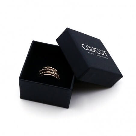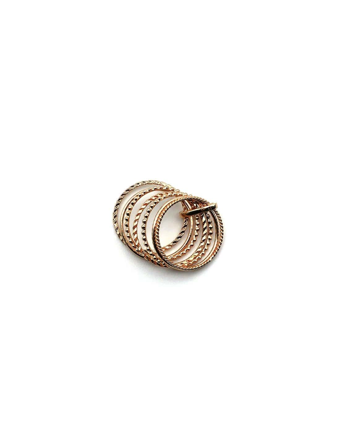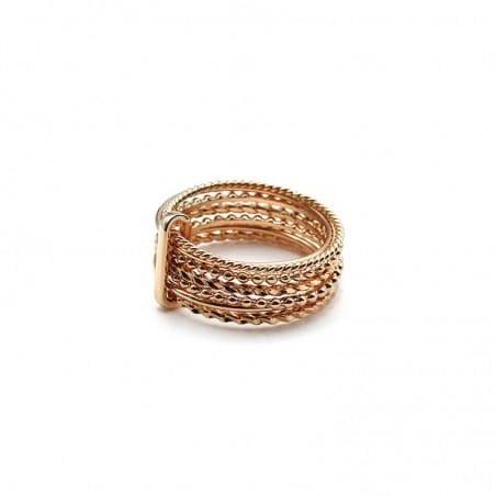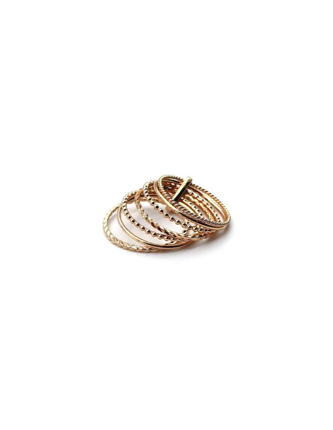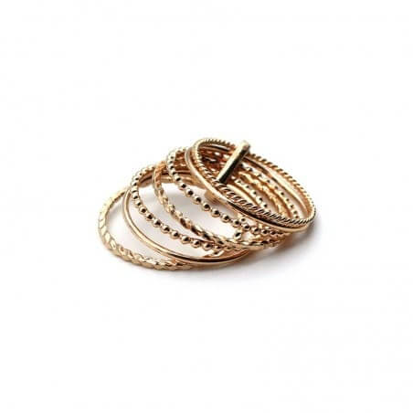 Cette bague semainier en plaqué or est composé de 7 anneaux fins texturés en or torsadé, lisse, ciselé ou finement perlé. Gracieuse, cette bague semainier affinera vos doigts.