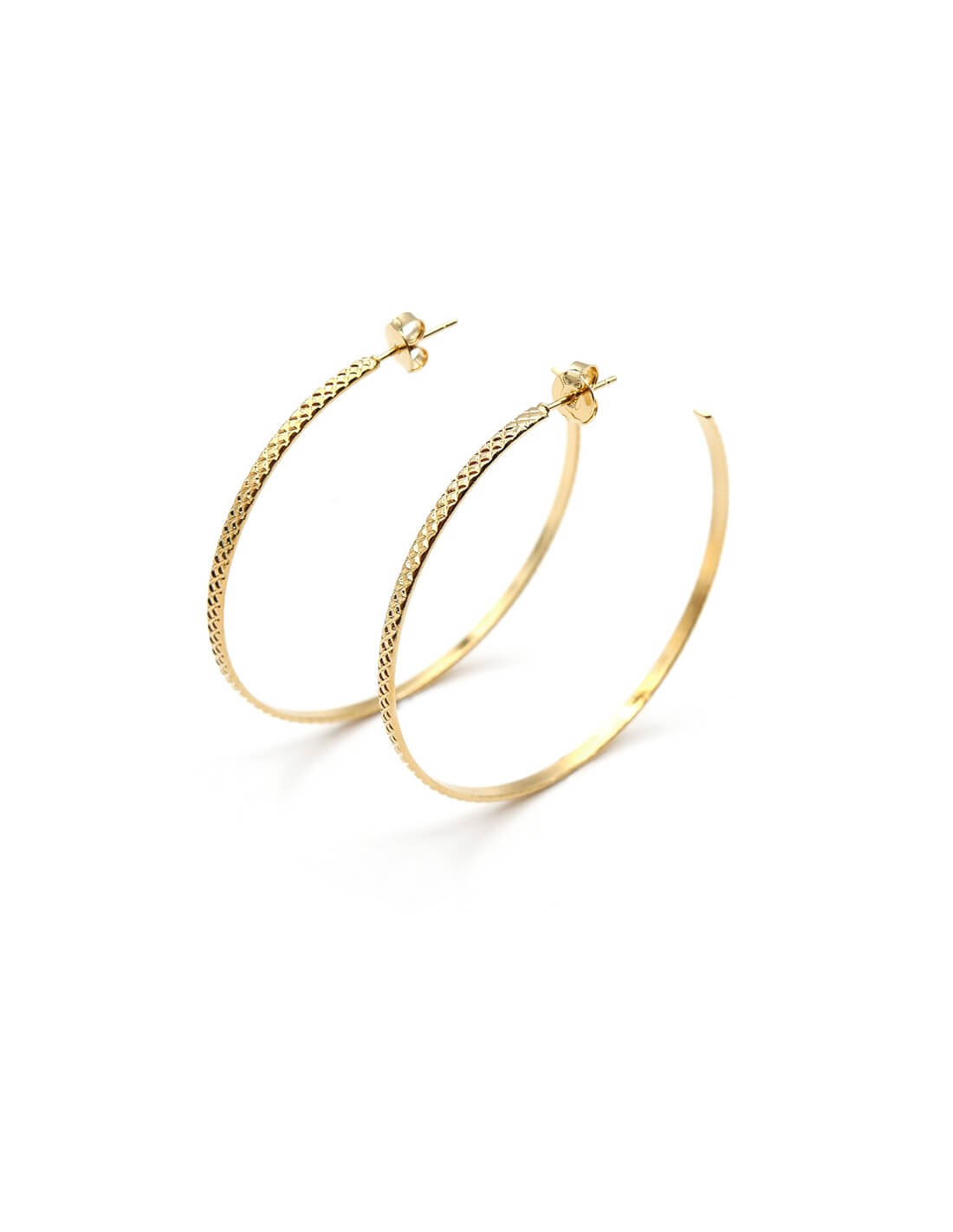 Ces créoles en plaqué or sont d'une élégance absolue. Le métal est travaillé avec un effet texturé apportant de la lumière à celles-ci.