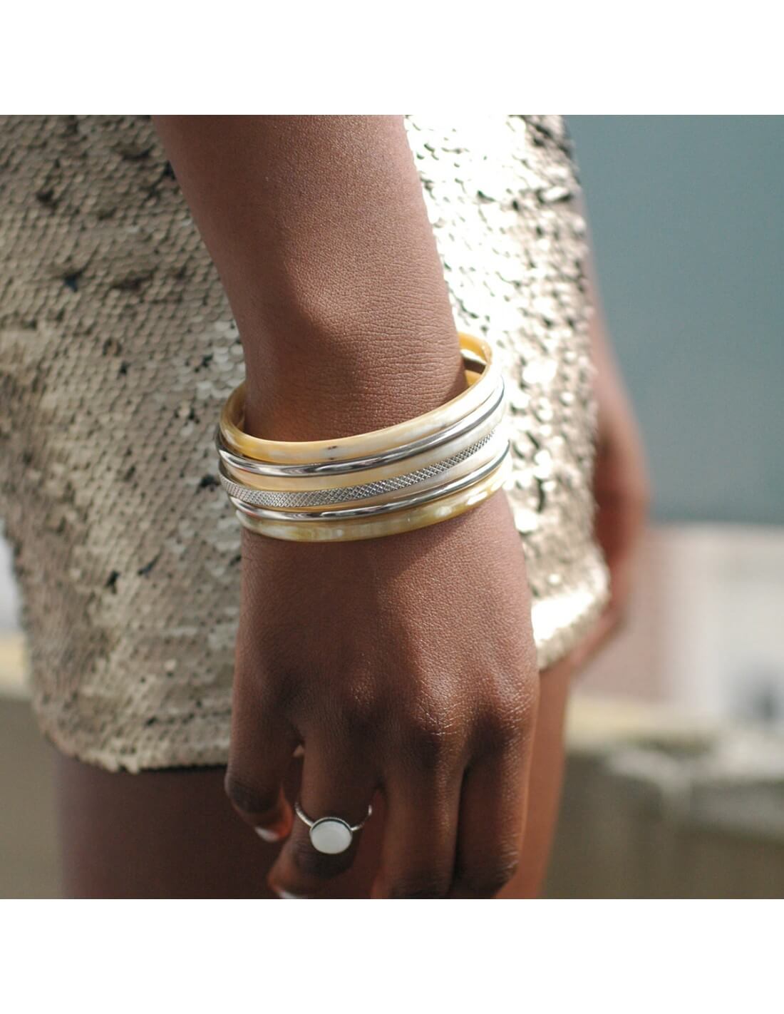 DES JONCS EN CORNE À STACKER À L'INFINI. Ce bracelet jonc est taillé dans la corne. C'est une pièce incontournable de notre marque. Accumulez plusieurs joncs en corne ou mixez les avec les joncs en corne de différentes largeurs et composez un "stack" moderne qui ne ressemble qu'à vous. Le semainier en corne séduit les femmes en quête d'un bijou authentique qui raconte une histoire. Le semainier c’est la combinaison de 7 bracelets fins appelé jonc. Portez le premier le lundi, puis ajoutez un bracelet chaque jour de la semaine ! Un rituel qui vous fait prendre conscience que chaque jour est un cadeau.