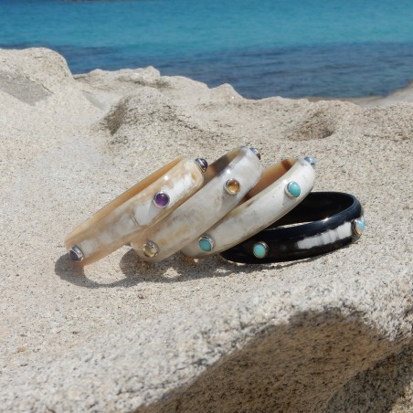 Craquez pour ce jonc empierré des plus belles gemmes. Ce généreux jonc en corne est surmonté de cinq pierres rondes taillées en cabochon de diamètre 6 mm. Ce jonc raffiné présente des pierres naturelles dans un heureux jeu de couleurs : des petites merveilles qui scintillent à chaque mouvement de bras. Faites votre choix parmi 9 pierres fines, des plus sombres aux plus lumineuses.