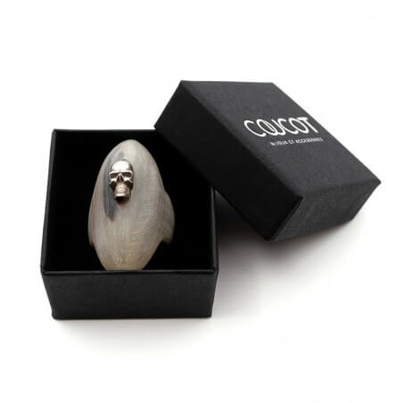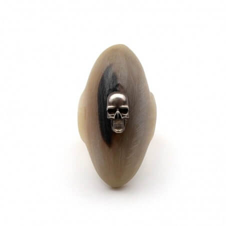 Hommage au temps qui passe, cette bague jonc en corne est surmontée d'une tête de mort en argent vieilli fait référence aux Memento Mori.