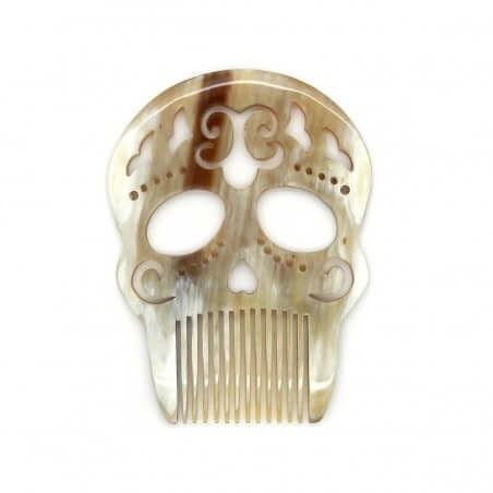 Julie, la créatrice, a travaillé une série de peignes autour de la thématique des Calaveras (crâne) dont la calavera arabesque est une pièce d'une série de 5 peignes. Ce peigne représente le Calavera (crâne Mexicain), symbole de la "Dia de los muertos" qui est une fête instaurée en 1920 célèbrant les défunts.